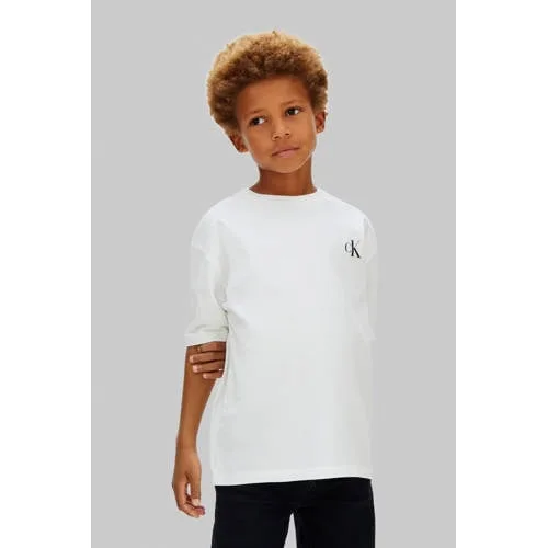 Een fris basisshirt voor elke dag: dit witte Calvin Klein T-shirt voor jongens is een praktische essential in de kledingkast. De effen kleur maakt het makkelijk te combineren met jeans, joggers of een korte broek. Gemaakt van 100% katoen voelt het materiaal zacht en soepel aan op de huid, ideaal voor schooldagen, vrije tijd en onderweg.Belangrijkste kenmerken van dit T-shirt Artikeltype: T-shirt voor jongens met korte mouwen Effen wit, makkelijk te combineren met verschillende outfits Ronde hals die prettig aansluit zonder te knellen Gemaakt van 100% katoen voor een zachte, ademende touch Geen borstzak, voor een rustige en tijdloze uitstraling Verpakking bevat één stuk, handig als gericht basisitemElke dag draagbaar en veelzijdigDit T-shirt is geschikt voor veel momenten op een dag. Draag het los op een spijkerbroek of joggingbroek, of onder een overhemd of hoodie als extra laag. De korte mouwen en het lichte katoen maken het ook prettig op warmere dagen of tijdens actieve momenten.Calvin Klein: moderne basics met stijlCalvin Klein staat bekend om moderne, heldere ontwerpen met aandacht voor pasvorm en detail. De kindercollecties sluiten daar naadloos op aan, met kleding die comfortabel aanvoelt en er verzorgd uitziet. Zo haal je met dit T-shirt een betrouwbare basic in huis die er na vaak dragen nog steeds goed uitziet.Een comfortabele basis voor alledaagse outfits, waar je kind gemakkelijk naar grijpt.