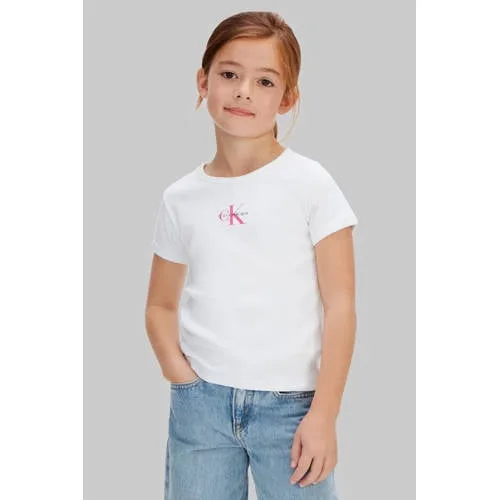 Dit witte Calvin Klein meisjes T-shirt is een basic shirt met een moderne uitstraling. Het korte mouwtje, de ronde hals en het subtiele logo op de voorkant maken het geschikt voor schooldagen, vrije tijd en alles daartussenin. Dankzij het zachte stretchkatoen sluit het T-shirt mooi aan, zonder strak te voelen.Comfortabel en makkelijk te combineren Gemaakt van zacht stretchkatoen voor een soepele, comfortabele fit Korte mouwen en ronde hals, geschikt voor elke dag Witte kleur met logo, eenvoudig te combineren met jeans, rok of short Rechte mouwen voor een rustige, moderne look Geen zakken, waardoor de focus op het logo en de pasvorm ligtElke dag draagbaarDit T-shirt past makkelijk in de garderobe van schoolkind en tiener. Draag het op een jeans en sneakers voor een casual dag, of onder een vest als extra laag. De elastische stof beweegt soepel mee, wat prettig is tijdens spelen, sporten of onderweg naar school.Calvin Klein voor kidsCalvin Klein staat wereldwijd bekend om strak vormgegeven basics met herkenbaar logo. Ook de kidscollectie sluit daarop aan, met comfortabele items met een soepele pasvorm die er modern uitzien. Zo haal je met dit T-shirt een praktisch basisstuk in huis waar je kind iedere dag iets aan heeft.Een basis T-shirt dat elke outfit een rustige en verzorgde uitstraling geeft.