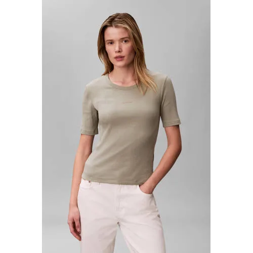 Deze Calvin Klein top is een moderne basic met een verfijnde uitstraling, ideaal voor dagen waarop je er verzorgd uit wilt zien zonder veel na te denken over je outfit. De grijsgroene kleur geeft een rustige, eigentijdse look en laat zich makkelijk combineren met je favoriete jeans, pantalon of rok. Door de ribgebreide structuur volgt de top subtiel je lichaam, zonder strak aan te voelen.Ribgebreide top met subtiel logo Rib gebreid materiaal voor een soepel en licht aansluitend effect Gemaakt van katoen met elastaan, wat zacht aanvoelt en licht meebeweegt Korte, rechte mouwen voor een frisse en tijdloze uitstraling Ronde hals die mooi langs de halslijn valt Klein logo detail dat de herkenbare Calvin Klein stijl benadrukt Geen zakken, waardoor het silhouet rustig en strak blijftElke dag combineren in jouw stijlDeze top past gemakkelijk in je dagelijkse garderobe. Draag de top in het voorjaar solo op een lichte jeans, of combineer met een blazer voor een nettere look. De ribstructuur geeft genoeg uitstraling om de top los te dragen, maar de top komt ook goed tot zijn recht in een hoge taille broek of rok.Calvin Klein: herkenbare eenvoudCalvin Klein staat bekend om heldere lijnen, moderne basics en betrouwbare kwaliteit. De Boutique collectie sluit aan bij een stijlvolle, eigentijdse smaak, met items die lang relevant blijven in je kledingkast. Je haalt een top in huis die past bij zowel een casual dag als een iets meer geklede gelegenheid.Een veelzijdige basis waarmee je in elke combinatie rustig en verzorgd voor de dag komt.