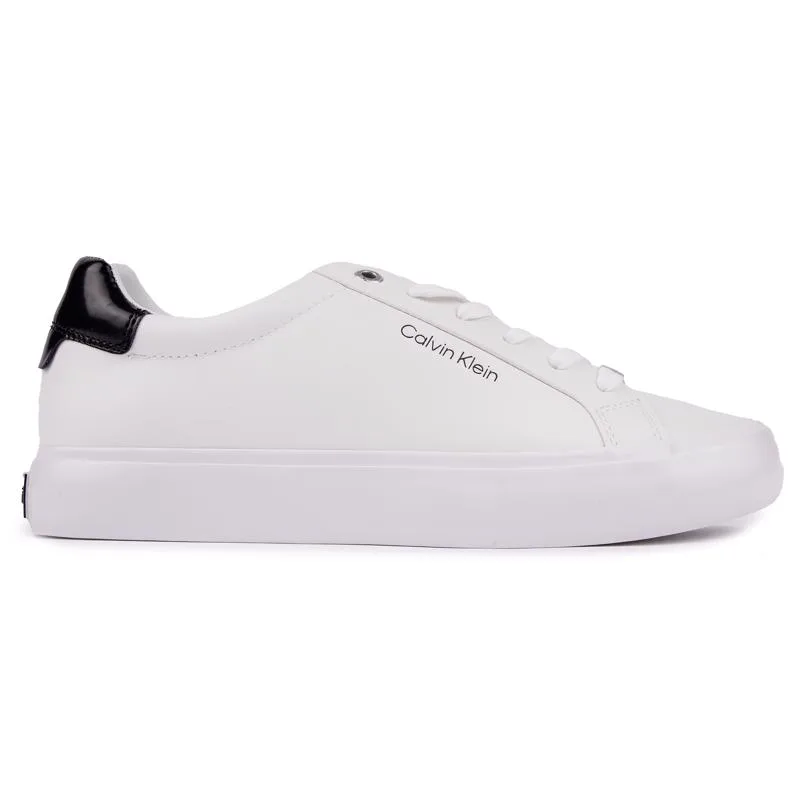 Deze Calvin Klein Cup Sole Lace Up Trainers zijn een moderne interpretatie van je klassieke courtschoen met een modieuze uitstraling. Het ontwerpersitem heeft een frisse witte leren bovenkant met een gemerkte zilveren oog, een opvallende gemerkte metalen vetersieraden en een glanzend zwart hakdetail.