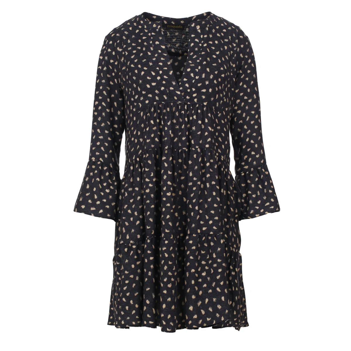 Deze jurk met all-over print en geplooide naden is gemaakt van geweven viscose. Met ¾ klokmouwen en een ronde halslijn met een V-opening van 24 cm aan de voorkant. Met een drukknoop onderaan de binnenkant van de V om te voorkomen dat deze te veel opent. Onder de V-opening aan de voorzijde bevindt zich langwerpig gevormde dubbele stof. De jurk heeft twee 24 cm brede, geplooide panelen. Met een dubbele plooi aan de achterkant. De jurk is gestyled in een los A-lijnsilhouet en valt boven de knie.