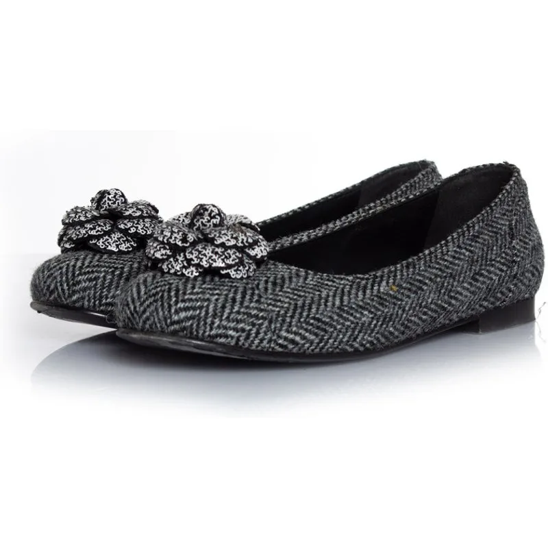 VINTAGE, RRP ALS NIEUW Chanel, Camellia flats in grijs visgraat. Het artikel verkeert in zeer goede staat en wordt geleverd met doos en boekje. • STAAT: zeer goede staat • MAAT: 38 • INZOLENMETINGEN: 25 cm • HIELMETINGEN: 1,5 cm PLATFORM: 0,5 cm • STOF: tweed • KLEUR: grijs