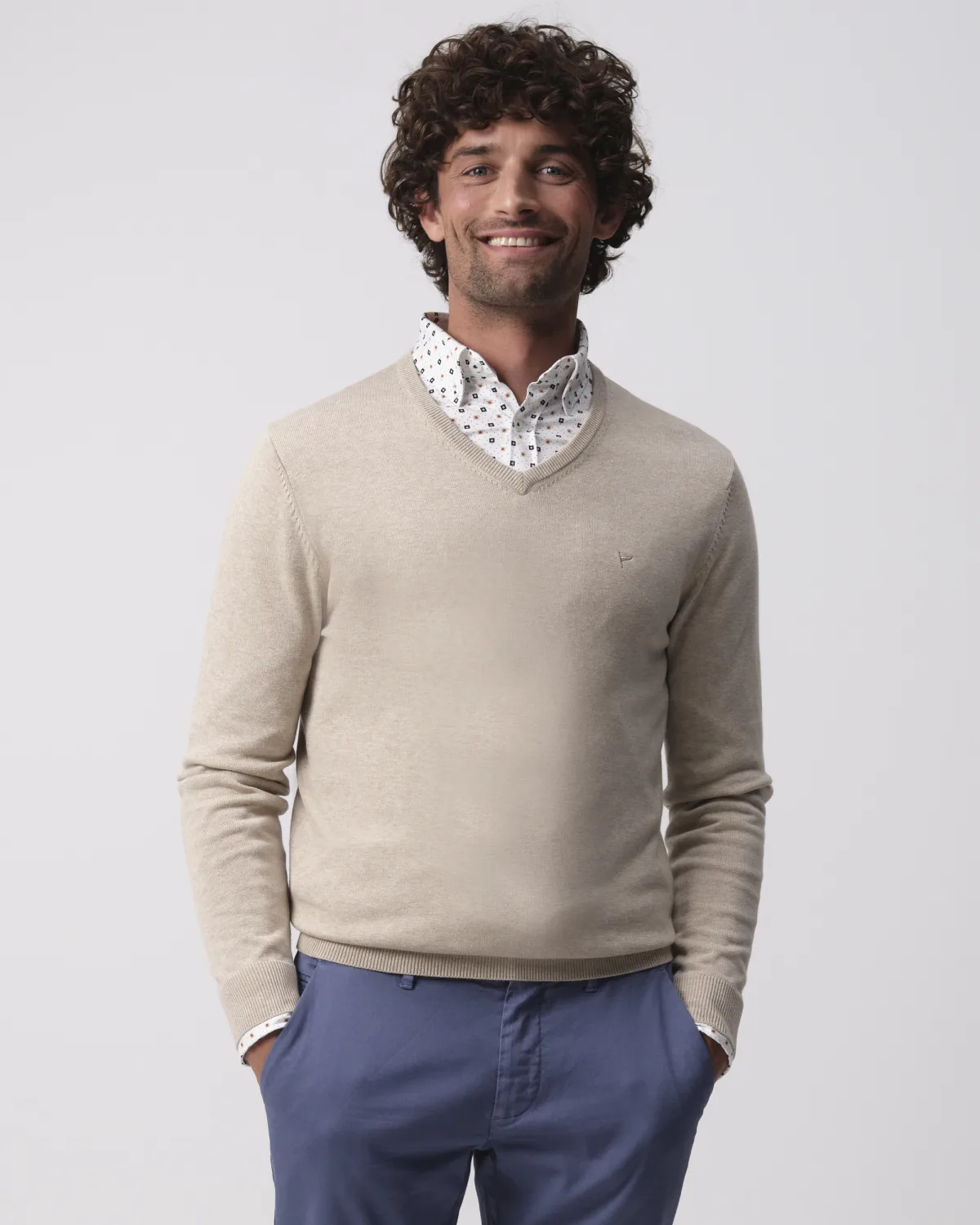 Stijlvolle Truien v hals voor mannen in maat: XXL. Gemaakt van 87% katoen, 11% polyamide, 2% elastomeer voor comfortabele pasvorm. Shop deze trui in de kleur: Beige die perfect is voor elke gelegenheid. Deze Truien v hals combineert kwaliteit met een moderne pasvorm– onmisbaar in elke herengarderobe!