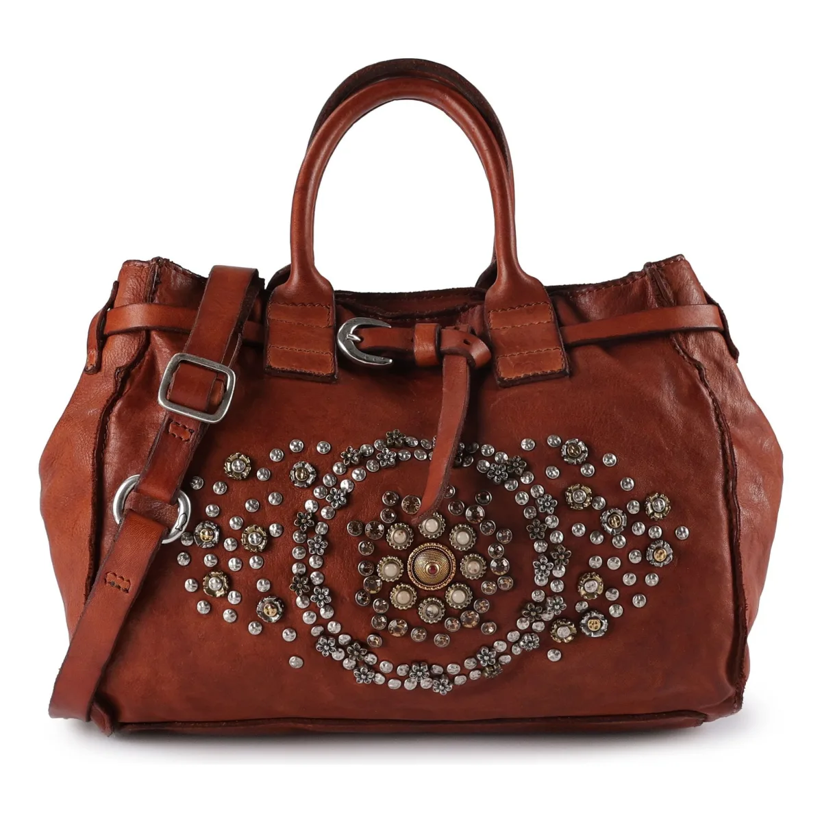 Design: Ruim hoofdvak; Type sluiting: Ritssluiting; Materiaal: Leer; Extra's: Applicaties; Hengsellengte: Korte schouderriemen