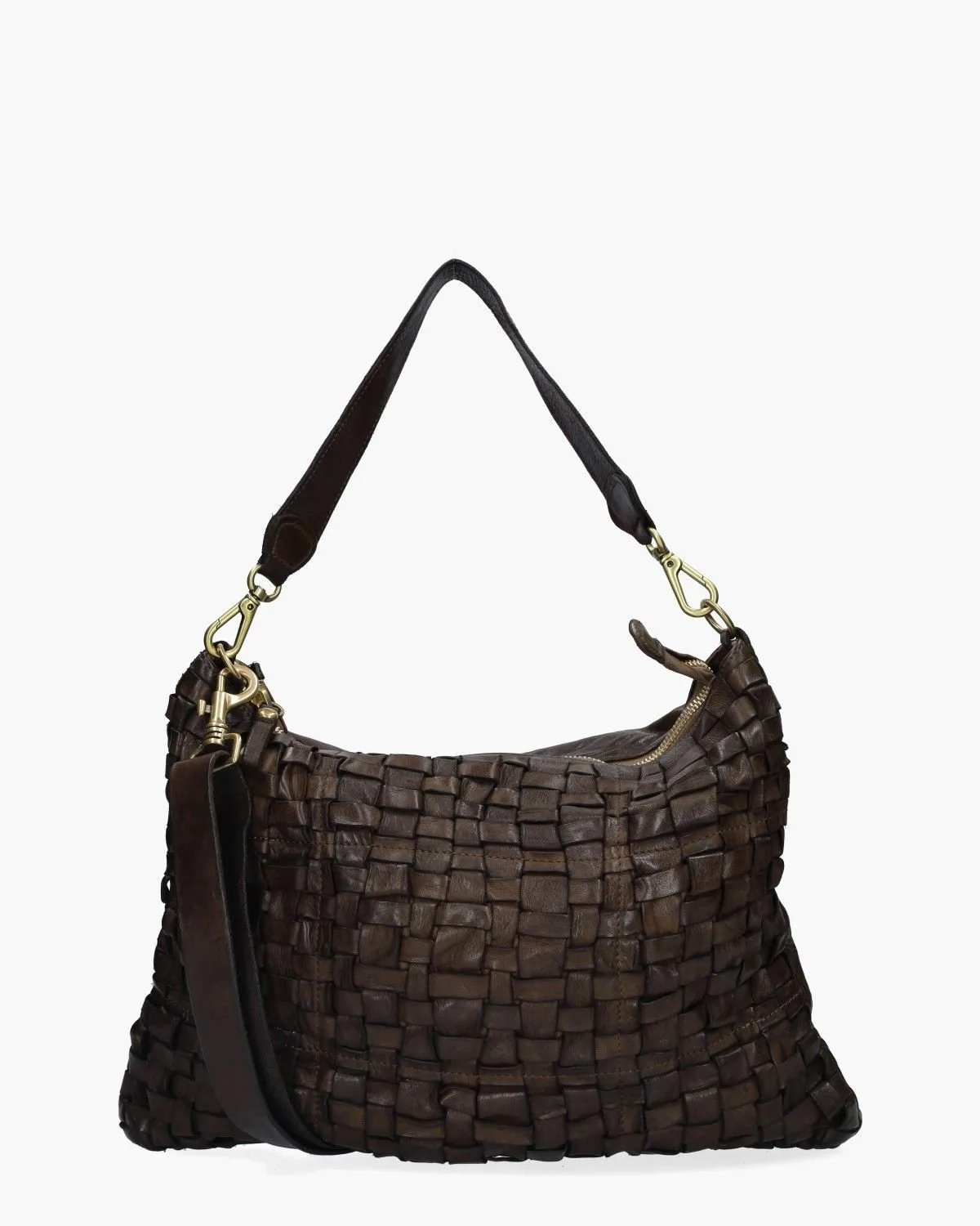 Elegant, stijlvol en praktisch– de Campomaggi Monospalla C040610ND.X2273.C1501 schoudertas heeft het allemaal. Het donkerbruine gevlochten leer benadrukt het vakmanschap van Campomaggi en geeft de tas een luxueuze uitstraling. De ritssluiting opent naar een ruim hoofdvak met een extra ritsvak en telefoonvak voor dagelijkse essentials.