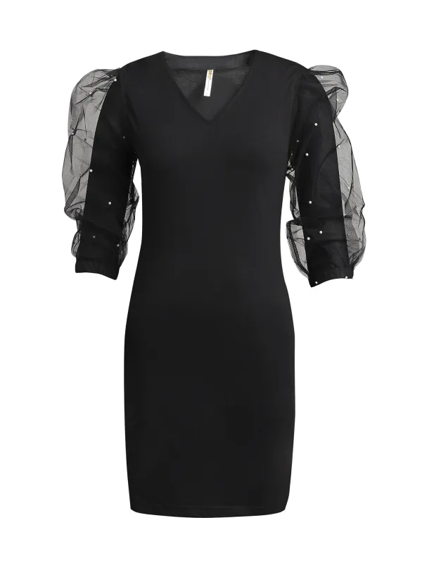 Type sluiting: Ritssluiting; Halstype: V-hals; Motief: Effen; Details: Gedrapeerd, Parels; Lengte: Kort/mini; Pasvorm: Aansluitende pasvorm; Armlengte: Driekwart mouw