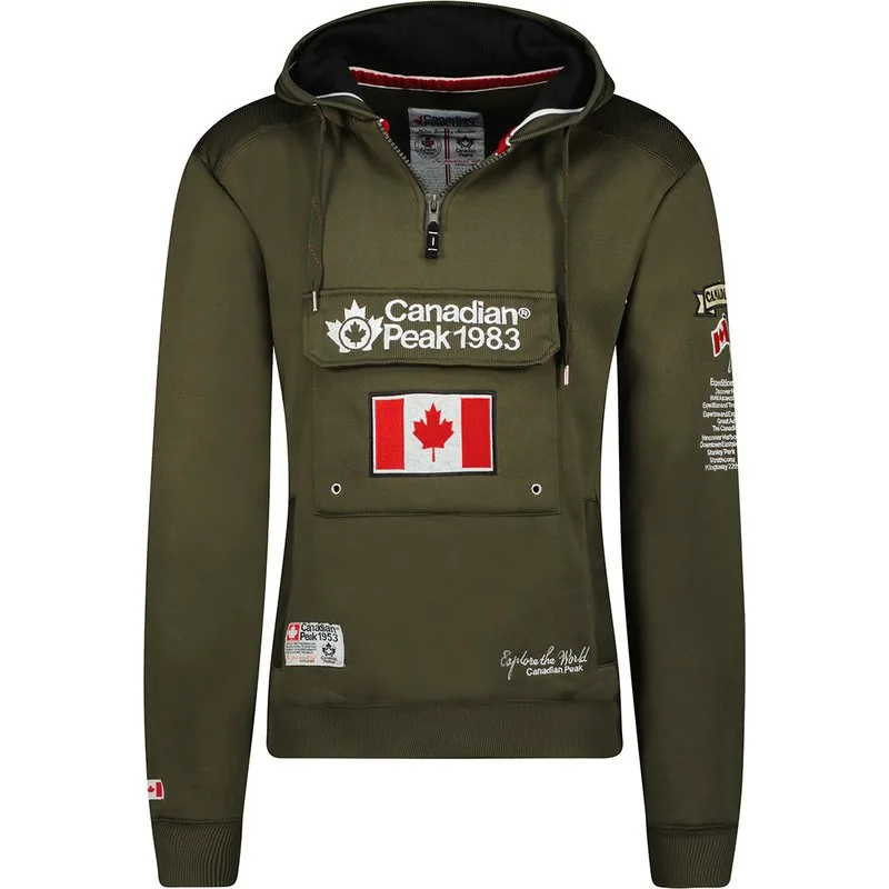 Canadian Peak - Heren Anorak Trui - Capuchon - Sweat - Hoodie - Galapagos - Kaki groen Materiaal: Katoen / Polyester Dessin: Met borduur - Print. Capuchon: Ja, niet afneembaar. Pasvorm: Getailleerd / Slim Fit. Soort: Hoodie, Sweat. Zakken: Kangaroe zak, 2 buitenzakken.