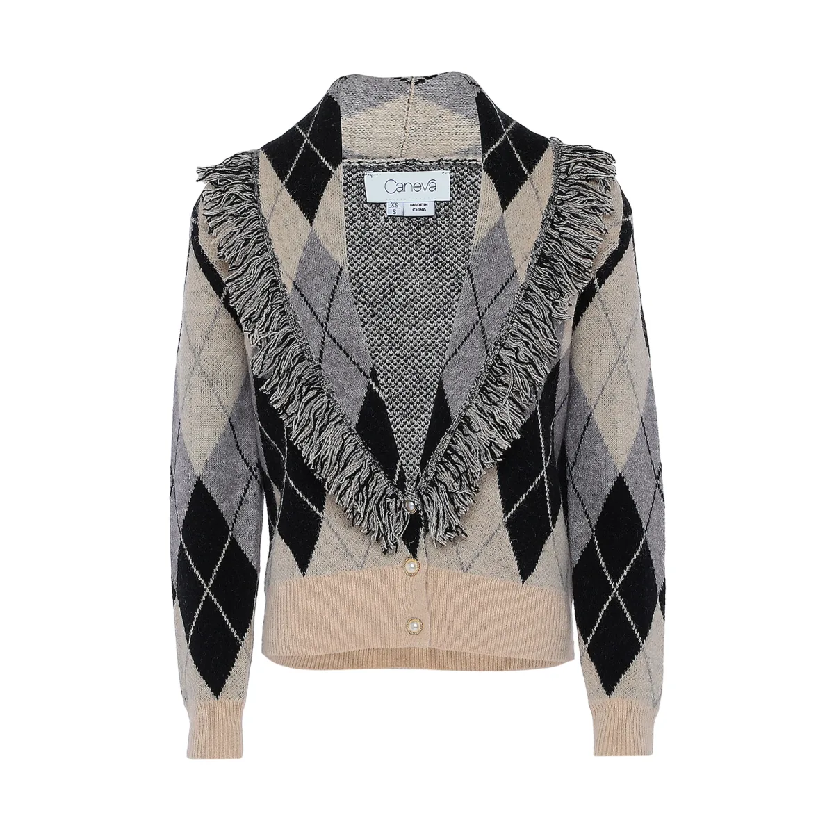 Design: Knop placket, Geribd ceintuurtje; Halstype: Sjaalkraag; Details: Franjes; Extra's: All-over patroon; Pasvorm: Normale pasvorm; Armlengte: Lange mouw; Lengte: Normale lengte