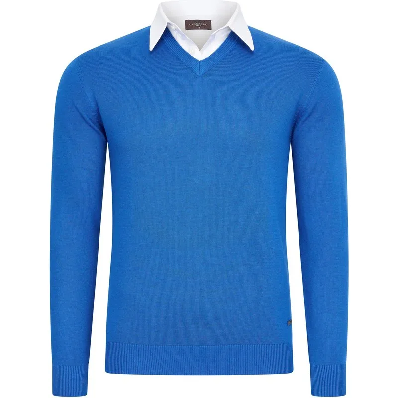 Cappuccino Italia mock pullover voor heren. De pullover is gemaakt van 50% katoen en 50% polyester en heeft een normale pasvorm. De trui is voorzien van een overhemdkraag, die is vastgestikt aan de pullover. Merk: Cappuccino ItaliaModelnaam: Mock Pullover (met overhemdkraag)Categorie: heren truiMaterialen: katoen, acrylKleur: royal blauw, wit