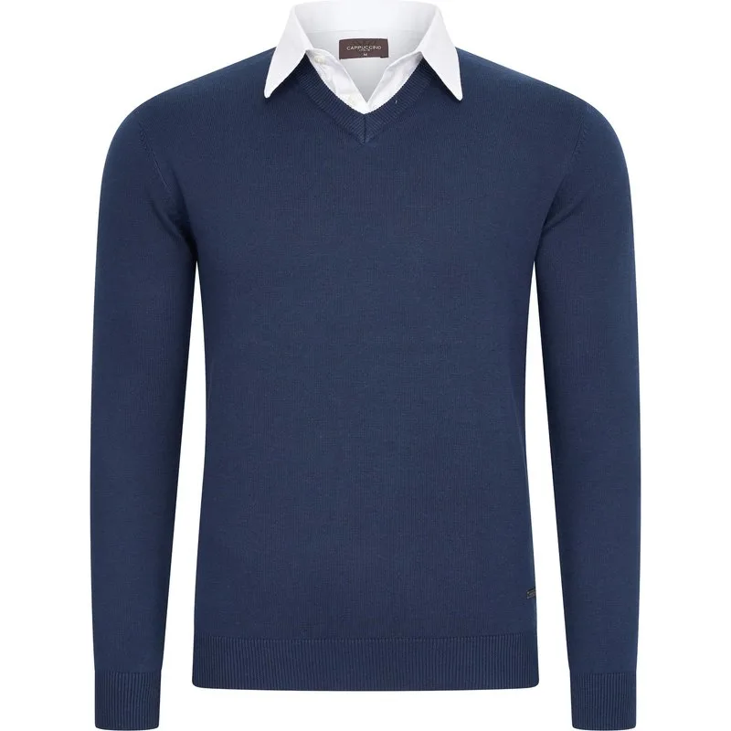 Cappuccino Italia mock pullover voor heren. De pullover is gemaakt van 50% katoen en 50% polyester en heeft een normale pasvorm. De trui is voorzien van een overhemdkraag, die is vastgestikt aan de pullover. Merk: Cappuccino ItaliaModelnaam: Mock Pullover (met overhemdkraag)Categorie: heren truiMaterialen: katoen, acrylKleur: navy blauw, wit