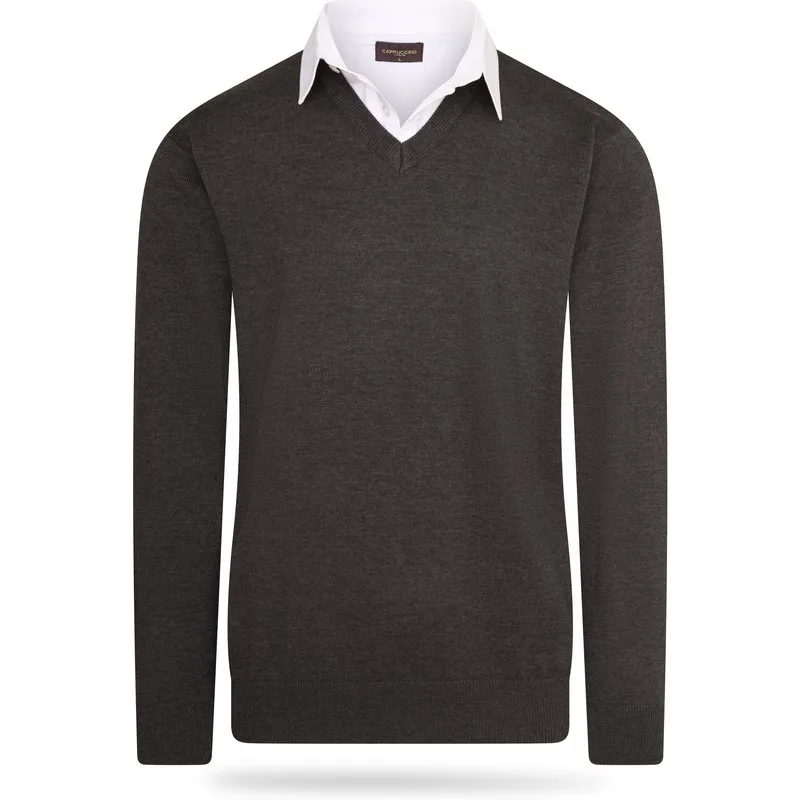 Cappuccino Italia Mock Pullover voor heren. De Mock Pullover is gemaakt van 50% katoen en 50% acryl en heeft een normale pasvorm. De trui is voorzien van een overhemdkraag, die is vastgestikt aan de pullover. Merk: Cappuccino ItaliaModelnaam: Mock Pullover (met overhemdkraag)Categorie: heren truiMaterialen: katoen, acrylKleur: antraciet grijs, wit