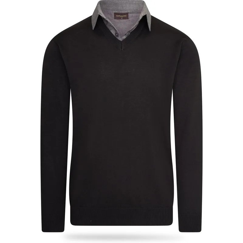 Cappuccino Italia Mock Pullover voor heren. De Mock Pullover is gemaakt van 50% katoen en 50% acryl en heeft een normale pasvorm. De trui is voorzien van een overhemdkraag, die is vastgestikt aan de pullover. Merk: Cappuccino ItaliaModelnaam: Mock Pullover (met overhemdkraag)Categorie: heren truiMaterialen: katoen, acrylKleur: zwart, grijs