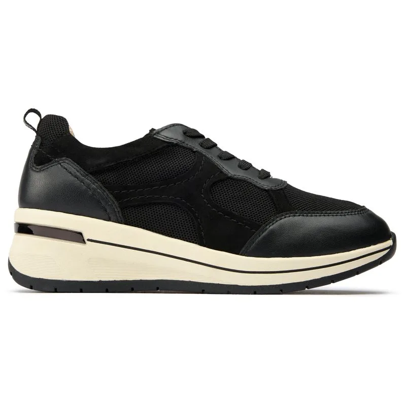 Zwarte Caprice comfort wedge trainers voor dames, gemaakt van leer en een rubberen zool. Met: wedge zool, comfort binnenzool en hiellus.