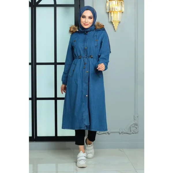 Stofkenmerk: Gemaakt van denim stof. Productkenmerk: Nieuwe seizoens hijab modeproduct. Gewatteerd met wol. Voorzijde met ritssluiting en knopen. Elastische manchetten. Taille is met koord verstelbaar. Pocket is aanwezig. Capuchon is afneembaar. Productkleur kan afwijken door conceptfoto's. Model draagt maat 38. Maat 38 Jas Maat: Productlengte: 115 cm - Borst: 102 cm - Taille: 92 cm - Heupen: 110 cm Lichaamsmaten nemen toe met 3 of 4 cm. (Productlengte verandert niet)