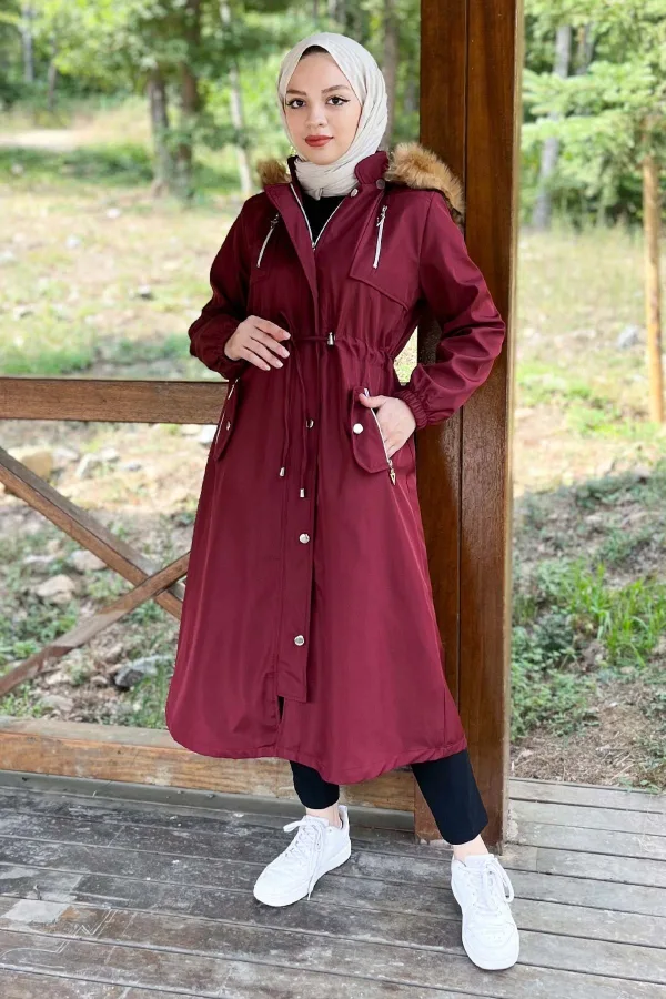 Stofeigenschap: Gemaakt van gebonden stof.Producteigenschap: Het is een nieuw seizoen hijab modeproduct. Het heeft een bontvoering. Het heeft een voorrits die gebruikt kan worden. Er is een zak. De capuchon is afneembaar. Het heeft een tailleband. Door conceptopnames kan er een lichte kleurverschil zijn met het product. Het model draagt maat 38.Maat 38 Jas Afmetingen: Productlengte: 118 cm - Borst: 102 cm - Taille: 88 cm - He