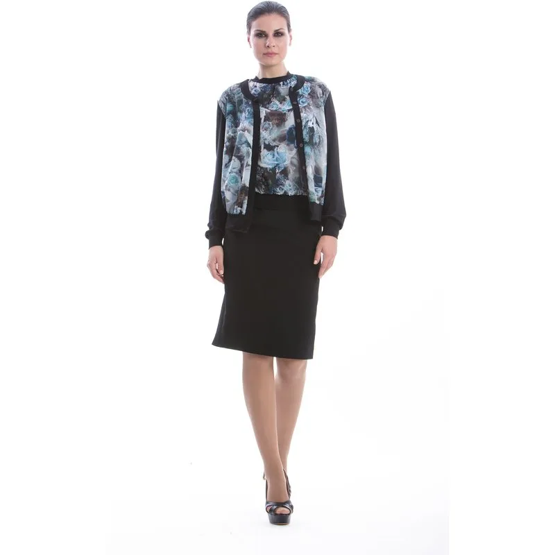 Vest CONQUISTA van zwarte viscose-elastan stof met voorpand in printpolyester. Lange mouwen en een knoopsluiting voor. Rimpels aan de zoom en aan de manchetten. Het model is 1.77m en draagt maat 36/S.