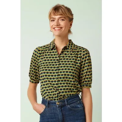 “De combinatiemogelijkheden zijn eindeloos met Carina!” Deze tijdloze beauty heeft een puntig kraagje, 1/2 pofmouwtjes en een elegante knopenreeks aan de voorzijde. Ze is uitgevoerd in een zachte, soepele en stretchy EcoVero viscosemix in zwart met een geometrische print in groentinten— een genot om te dragen! * Puntig kraagje * 1/2 pofmouwen * Reeks knopen voorzijde * Lang genoeg om op een normale heupbroek te dragen