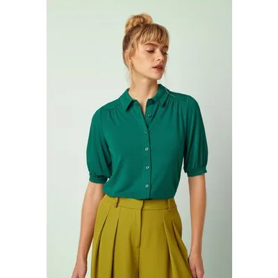 “De combinatiemogelijkheden zijn eindeloos met Carina!” Deze tijdloze beauty heeft een puntig kraagje, 1/2 pofmouwtjes en een elegante knopenreeks aan de voorzijde. Ze is uitgevoerd in een zachte, soepele viscose/lyocellmix met stretch en een vleugje circulose, in een prachtige ponderosagroene tint. Een genot om te dragen! * Puntig kraagje * 1/2 pofmouwen * Reeks knopen voorzijde * Lang genoeg om op een normale heupbroek te dragen