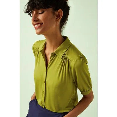 “De combinatiemogelijkheden zijn eindeloos met Carina!” Deze tijdloze beauty heeft een puntig kraagje, 1/2 pofmouwtjes en een elegante knopenreeks aan de voorzijde. Ze is uitgevoerd in een zachte, soepele en stretchy EcoVero viscosemix in een prachtige pistachegroene tint — een genot om te dragen! * Puntig kraagje * 1/2 pofmouwen * Reeks knopen voorzijde * Lang genoeg om op een normale heupbroek te dragen
