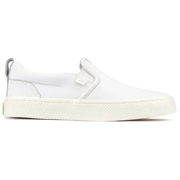 Spring in deze helderwitte Cariuma Slip-on sneakers voor milieuvriendelijke stijl en comfort. Deze slip-on gymschoenen zijn gemaakt van zacht, LGW-gecertificeerd leer, een gedempte kurk plus binnenzool van biobased schuim voor casual comfort en een stevige rubberen zool voor grip. Omarm modieuze, relaxte ontwerpen met een goed geweten en verbeter je garderobe met deze skater-kicks van het merk.