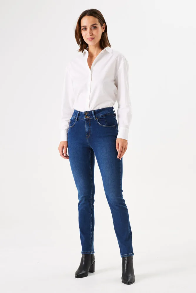 De Caro 285 shapejeans met een curved slim fit heeft een flatterende, liftende pasvorm door de doordachte constructie van naden en de plaatsing van de zakken. De coupenaad aan de zijkant van de achterzakken geeft extra ruimte om gevormde billen mooi uit te laten komen. Een extra kenmerk aan deze jeans is de brede tailleband met een dubbele knoopsluiting die goed aansluit op de heupen voor de perfecte pasvorm. De jeans sluit goed hoog aan in de taille wat bijdraagt aan de flatterende pasvorm. Verder sluit de jeans strak aan vanaf de bovenbenen tot de kuiten, daarna lopen de pijpen recht naar beneden. Hergebruik van materialen draagt bij aan een circulaire economie. Bij het creëren van dit GARCIA kledingstuk is gebruik gemaakt van een duurzame wastechniek.