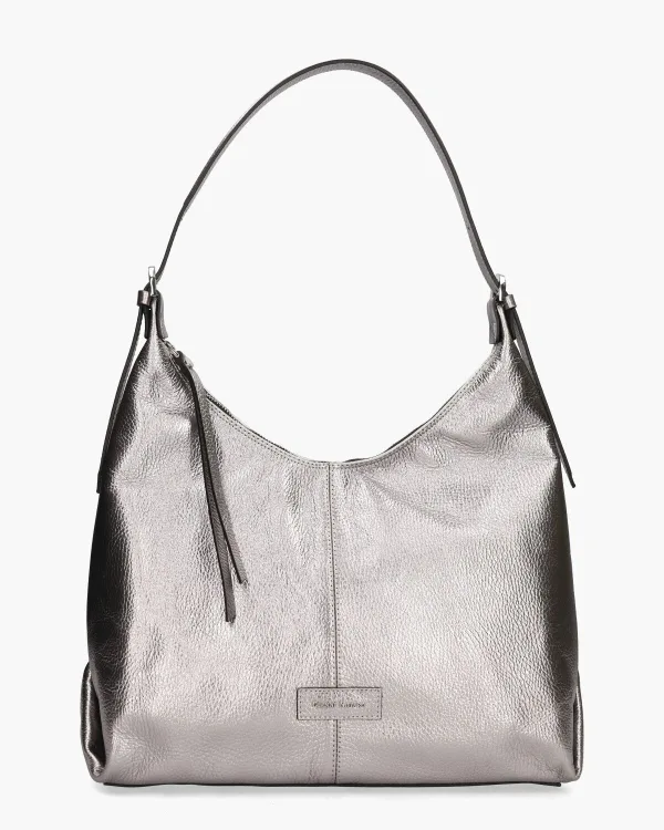 Zilverkleurige lederen schoudertas 455 uit de collectie van Carol J. by Gianni Notaro. De binnenkant is afgewerkt met textiel en beschikt overéén ruim compartiment met een handig steek- en ritsvakje voor een georganiseerde indeling. De tas sluit veilig met een rits aan de bovenzijde, terwijl de zilverkleurige hardware een elegante touch