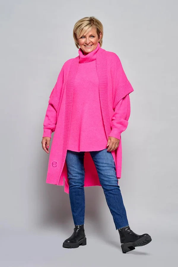 Het Burnaby vest in een opvallende roze tint is perfect voor een elegante en comfortabele look. Dit vest is voorzien van een uniek borduursel dat een persoonlijk verhaal vertelt, geïnspireerd door Caroline’s tatoeage. De duifjes symboliseren eeuwige liefde. Het vest heeft een zachte sjaalkraag van ribstof, brede ribboorden, en korte, aangeknipte mouwen. De rechte pasvorm, die tot op de knie valt, biedt zowel stijl als comfort. Gemaakt van een mix van 30% polyester, 27% nylon, 25% acryl, 15% wol en 3% elastaan, is dit oversized vest licht, zacht en ademend, wat het geschikt maakt voor elk seizoen. De levendige roze kleur van het vest maakt het gemakkelijk te combineren met andere kledingstukken. Voor een vrouwelijke uitstraling kun je het vest dragen met de witte Winslow blouse. Het Burnaby vest, met korte mouwen en open draagstijl, is ideaal om te dragen over de Brampton trui voor een winterse look. Ontdek de veelzijdigheid en het stijlvolle karakter van deze combinaties.