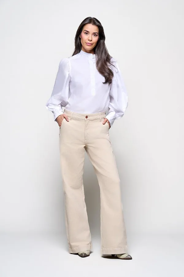 Zandkleurige flared spijkerbroek – stijlvolle dameslooksDe zandkleurige flared spijkerbroek is een veelzijdig item waarmee je zowel casual als chique outfits kunt samenstellen. Voor een frisse, dagelijkse look combineer je de broek met de Lucia Blouse of een van de sweaters uit de Caroline Tensen collectie voor een ontspannen en stijlvolle uitstraling. Voor een geklede outfit past de stretch flared spijkerbroek perfect bij een aansluitende top of de Malmo Blouse.Tijdens koelere dagen vormt het flared model een uitstekende basis onder een lange mantel of blazer, terwijl de verhoogde taille het figuur flatteert en een gestroomlijnd effect creëert.Fashion tip: verkrijgbaar in coated denim, lichtblauw en streep.
