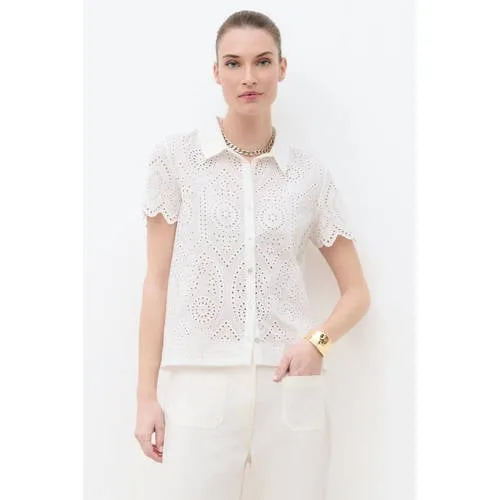 Deze witte katoenen blouse met broderie geeft je outfit direct een lichte, vrouwelijke uitstraling. Het spel van semi-transparant kant en broderie zorgt voor een verfijnd effect, terwijl de rechte pasvorm comfortabel valt en veel bewegingsvrijheid biedt. De overhemdkraag en knoopsluiting aan de voorkant maken de blouse geschikt voor zowel casual als meer geklede momenten.Kenmerken van deze kanten blouse Artikeltype: blouse met T-shirt look en korte mouwen Rechtvallende pasvorm, prettig voor verschillende lichaamsvormen Overhemdkraag en volledige knoopsluiting aan de voorkant Semi-transparant kant-effect met broderie voor een verfijnde structuur Effen wit, goed te combineren met andere stukken in je garderobe Gemaakt van 100% katoen, voelt zacht en luchtig aan Lengte 58 cm voor maat S, kort model dat mooi boven de heup valt Rechte mouwen zonder omslag, korte mouwlengteTe dragen in lichte, vrouwelijke combinatiesDeze blouse past goed bij een wijde broek en sandalen met hakken voor een vrouwelijke set. Ook combineert de kanten structuur mooi met een vloeiende rok en ballerina's, of onder een lichte jas wanneer je een verfijnde laag zoekt in het voorjaar.Caroll: Franse verfijning in je garderobeCaroll staat bekend om tijdloze damesmode met een verzorgde uitstraling. De collecties zijn afgestemd op een moderne levensstijl, met aandacht voor pasvorm en draagcomfort. Deze blouse past in de feminine collectie, met zachte lijnen en doordachte details.Was de blouse op 30°C in een fijnwasprogramma, laat aan de lucht drogen en strijk op lage temperatuur tot maximaal 110° zonder stoom, zodat het breisel en de broderie mooi blijven.