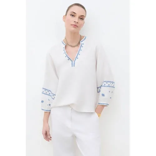Voor zonnige dagen en ontspannen momenten is deze linnen dames blousetop van Caroll een verfijnde basic voor je garderobe. Het korte overhemd heeft een rechte snit die soepel langs het lichaam valt en de taille subtiel camoufleert. De ecru kleur met lichtblauwe details geeft een frisse, zomerse uitstraling die makkelijk te combineren is met je favoriete broeken en rokken.Luchtige details voor elke dag Kort overhemd met rechte snit voor een relaxed, modern silhouet Tunische kraag met V-hals voor een open, vrouwelijke halslijn 3/4 ballonmouwen zorgen voor een luchtig en elegant effect Effen ontwerp met subtiele borduursels voor een verzorgde uitstraling Linnen en viscose zorgen voor een licht en ademend draaggevoel Lengte 62,5 cm bij maat 38, verkrijgbaar in maten 34 tot 44Makkelijk te combineren in je dagelijkse stijlDeze top past net zo goed bij een vloeiende broek en hakken als bij een donkere jeans en platte schoenen. Ideaal voor een casual chic look op kantoor, in het weekend of tijdens een etentje. De rechte vorm laat zich moeiteloos in of over de broek dragen.Caroll: tijdloze mode met een vrouwelijke twistCaroll richt zich op moderne vrouwen die houden van verzorgde, draagbare mode met een elegante uitstraling. De collecties combineren verfijnde details met comfortabele pasvormen, waardoor je je de hele dag zelfverzekerd en op je gemak voelt.Een lichte, stijlvolle top waar je de hele zomer lang naar grijpt.
