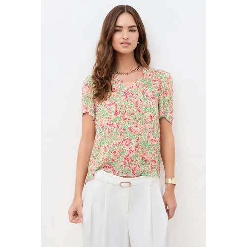Deze luchtige top van Caroll is een praktische basis voor je garderobe in het voorjaar. De rechte pasvorm valt soepel langs je lichaam en valt los rond de taille. De tunicakraag en korte mouwen geven de bloemenprint dames top een ontspannen maar verzorgde uitstraling. De print in groen, roze en ecru zorgt voor een frisse uitstraling die makkelijk te combineren is.Kenmerken van deze bloemen top Rechte snit die comfortabel valt en niet tekent rond de taille Tunicakraag voor een moderne, open halslijn Korte mouwen met rechte inzet voor een rustige, nette look Lengte 61 cm in maat 38, valt rond de heup Gemaakt van 100% viscose, een soepele stof met zachte touch Bloemenprint in groen, roze en ecru voor een rustige kleurenmix Zonder sluiting, waardoor de top makkelijk aan en uit te trekken isGemakkelijk te stylen in het dagelijks levenCombineer deze top met een vloeiende, hoog getailleerde broek en platte sandalen voor een lichte, ontspannen outfit. Voor een meer geklede stijl past de top goed op een midi rok met uitlopende snit en hakken. Door de rustige kleuren is de top ook geschikt onder een lichte blazer.Caroll: eigentijdse stijl en draagbare modeCaroll ontwerpt kleding die verzorgd oogt en praktisch is in het dagelijks leven. De ontwerpen hebben vaak tijdloze lijnen en doordachte details, zodat je de stukken seizoen na seizoen kunt blijven dragen. Met deze top kies je voor een verzorgde, moderne uitstraling die past bij uiteenlopende gelegenheden.Een praktische keuze als je zoekt naar een lichte top die zowel casual als gekleed inzetbaar is.