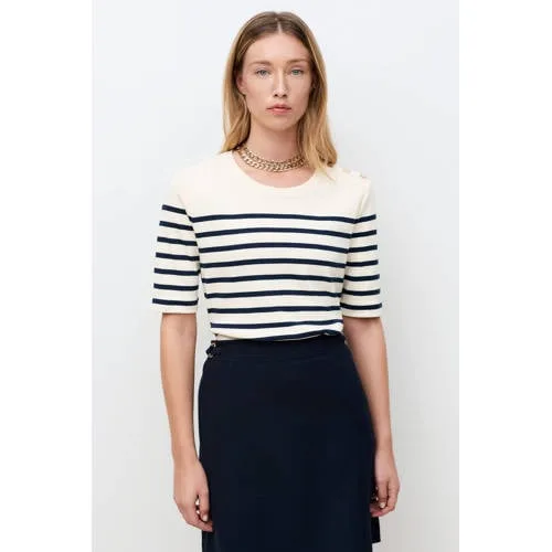 Voor een rustige, maar toch verzorgde look in je dagelijkse outfits is dit gestreepte dames T-shirt van katoen een praktische basis. De ecru kleur met zwarte strepen geeft een heldere uitstraling, terwijl de rechte snit luchtig valt. De korte mouwen en ronde hals maken het een item dat je makkelijk het hele voorjaar en de zomer door draagt.Kenmerken van het Tleiade T-shirt Gestreept T-shirt in ecru/zwart voor een heldere uitstraling Gemaakt van 100% katoen voor een zachte touch op de huid Rechte snit met korte mouwen voor een ontspannen pasvorm Ronde hals die mooi aansluit zonder te strak te vallen Sierknopen als subtiel detail op het bovenstuk Lengte 58 cm voor maat S, valt mooi op een broek of rokGemakkelijk te combineren in je dagelijkse looksHet Tleiade T-shirt laat zich eenvoudig combineren. Draag het op een rechte rok met mocassins voor een casual combinatie. Voor warme dagen is het ook geschikt met een vloeiende broek en platte sandalen, waardoor je een lichte, zomerse outfit krijgt.Caroll: Franse eenvoud met aandacht voor detailCaroll staat bekend om kledingstukken met een vrouwelijke uitstraling en doordachte details. De collecties zijn ontworpen met aandacht voor pasvorm en draaggemak, zodat je items in je kast hebt die je veel draagt. Dit Tleiade T-shirt past naadloos in die benadering.Een bovenstuk dat je garderobe rustig en verzorgd aanvult.