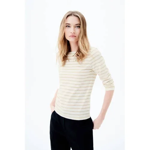 Dit Caroll gestreept T-shirt is een gestreepte basic met een subtiele verwijzing naar de matrozenstijl. De horizontale strepen geven direct structuur aan je outfit, terwijl de rechte pasvorm rustig en uitgebalanceerd oogt. Gemaakt van katoen met een subtiele metaalvezel, zodat het shirt zacht aanvoelt en tegelijk een lichte glans heeft.Gestreepte klassieker met subtiele glans Rechte pasvorm die langs het lichaam valt zonder strak te zitten Boothals voor een open halslijn Driekwartmouwen, ideaal tussen de seizoenen door Lengte van ongeveer 60 cm in maat S, prettig te combineren met zowel hoge als middelhoge tailles Gemaakt van 91% katoen en 9% metaalvezel voor een zachte touch met een lichte shimmer Horizontale strepen in een klassieke matrozenstijl Rechte mouwen en geen zakken voor een rustige, cleane lookVoor werk, weekend en vakantieDit T-shirt past net zo goed bij een nette broek als bij je favoriete jeans of een zomerse rok. De driekwartmouwen maken het geschikt voor kantoordagen, een lunchafspraak of een ontspannen dagje weg. Draag het los of licht in de taille gestopt voor een andere uitstraling.Caroll: Franse elegantie voor elke dagCaroll staat bekend om doordachte basics en kleding die je gemakkelijk combineert. De collecties zijn ontworpen met aandacht voor pasvorm en details, zodat je garderobe uit stukken bestaat waar je vaak naar grijpt en die lang goed blijven.Een gestreepte essential die je garderobe rustig aanvult en moeiteloos meegaat in jouw dagelijks ritme.