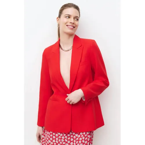 Voor een lichte, verzorgde laag over je outfit is deze rode dames blazer van linnen van Caroll een stijlvolle toevoeging. De rechte pasvorm valt soepel om je heen en volgt moeiteloos al je bewegingen, terwijl de gevoerde binnenkant zorgt voor een prettig draaggevoel. Dankzij het aandeel linnen voelt de stof luchtig aan op warme dagen en blijft hij ook op koelere momenten comfortabel.Belangrijke details op een rij Jack met rechte pasvorm en vrouwelijke lengte van 69 cm bij maat 38 Reverskraag en lange mouwen voor een tijdloze, nette uitstraling Met knoopsluiting en sierzakken aan de voorzijde Gevoerd voor extra comfort en een mooie, gladde val Gemaakt van lyocell 47%, linnen 30% en katoen 23% Effen rode kleur, goed te combineren met neutrale en ton-sur-ton items Vormt samen met de Podiumuni-broek een compleet pakVan werkdag tot bruiloftsgastDeze blazer leent zich voor verschillende momenten. Voor een werkdag combineer je het jack met een luchtige effen broek, een lichte blouse en leren loafers. Voor een gelegenheid als bruiloftsgast staat hij mooi over een jurk met hakken of sandalen, waarbij de rode kleur je look extra kracht geeft.De signatuur van CarollCaroll richt zich op elegante kleding met oog voor pasvorm en draaggemak. De items sluiten aan bij een moderne, vrouwelijke garderobe waarin je je verzorgd maar ook ontspannen voelt, of je nu onderweg bent naar kantoor of een speciale gelegenheid.Een blazer die je garderobe seizoen na seizoen verrijkt met een verzorgde, veelzijdige laag.