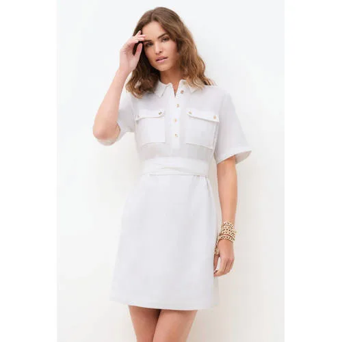 Deze ecru linnen jurk van Caroll brengt luchtigheid in je zomergarderobe. De korte jurk is gemaakt van 100% linnen, wat zorgt voor een frisse, lichte feel op warme dagen. De rechte, vloeiende snit valt soepel langs het lichaam, verlengt optisch het silhouet en geeft de taille een zachte uitstraling. De klassieke overhemdbovenkant met kraag en knoopsluiting geeft het geheel een rustige, verzorgde look.Zomerse details die het verschil maken Korte jurk met mini lengte voor een zomerse uitstraling Rechte en vloeiende pasvorm die prettig om het lichaam valt Overhemdkraag, knoopsluiting en borstzakken voor een tijdloos detail Korte, rechte mouwen voor extra bewegingsvrijheid Inclusief ceintuur om de taille subtiel te accentueren Gevoerd voor een prettige, niet-doorzichtige look Lengte 93 cm bij maat 38, beschikbaar in maten 36 tot 46 Gemaakt van 100% linnen voor een luchtig draaggevoelVan werkdag tot weekendDeze jurk past makkelijk in verschillende situaties. Combineer met sandalen met hak en een fijne armband voor een meer geklede uitstraling, of draag leren loafers en een lichte jas voor een moderne, alledaagse look.Verzorging van jouw Caroll jurkOm de kwaliteit van het linnen te behouden, is professionele reiniging bij de stomerij aan te raden. Thuis wassen kan op 30°C in een fijnwasprogramma. Die jurk mag niet in de droger. Strijk op lage temperatuur tot maximaal 110° en zonder stoom om de stof mooi te houden.Een lichte, verzorgde keuze voor zonnige dagen en heldere, frisse looks.