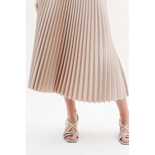 Deze beige midi plissé rok voor dames van Caroll is een passende keuze voor momenten waarop je een verzorgde uitstraling wilt. De rok heeft een soepelvallend design met fijne plooien en een uitlopende snit. De iriserende glans zorgt voor een subtiele schittering bij elke beweging, waardoor de rok geschikt is voor gelegenheden zoals een bruiloft of een diner.Details die het verschil maken Midi-lengte rok met een lengte van 80 cm bij maat 38 Uitlopende, vloeiende vorm die prettig om het lichaam valt Plissé ontwerp voor een elegante structuur Beige kleur met lichte glitters voor een chique accent Regular waist zonder sluiting voor een gladde tailleband Verkrijgbaar in maten 34 tot 44 Effen dessin, gemakkelijk te combineren met tops en truienVan bruiloftsgast tot dagelijkse chicAls bruiloftsgast combineer je deze rok met een blouse en pumps. Voor een meer alledaagse maar verzorgde look draag je de rok met een aansluitende trui met ronde hals en enkellaarsjes. De glanzende finish geeft je outfit steeds een feestelijke noot.Caroll: tijdloze vrouwelijkheidCaroll ontwikkelt kleding waarin comfort en een verzorgde stijl samengaan. De collecties sluiten aan bij het leven van moderne vrouwen die kiezen voor doordachte items die prettig dragen. Met deze rok voeg je een veelzijdig onderdeel toe aan je garderobe waar je lang gebruik van kunt maken.Een rok die je garderobe eenvoudig een feestelijke update geeft.