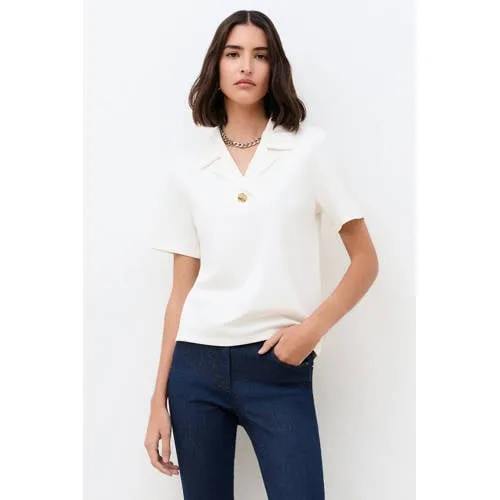 Voor een frisse, moderne basis in je garderobe is het Caroll Terry1 dames polo T-shirt een praktische keuze. De rechte pasvorm valt losjes langs het lichaam en de korte lengte geeft een eigentijdse uitstraling. De overhemdkraag met knoopsluiting zorgt voor een nette polo-look, terwijl de zachte, soepele stof prettig aanvoelt op de huid. In de rustige crème kleur draag je dit shirt moeiteloos naar werk, een etentje of een vrije dag.Details die je elke dag waardeert Rechte pasvorm voor een ontspannen, verzorgde look Overhemdkraag met knoopsluiting voor een nette polo-uitstraling Korte mouwen, ideaal voor het voorjaar en de zomer Korte lengte van 58 cm bij maat S voor een moderne proportie Zachte stof met viscose en lichte stretch voor extra draagcomfort Effen crème kleur die eenvoudig combineert met je garderobeMakkelijk te stylen voor elke dagVoor een zakelijke dag combineer je het Terry1 T-shirt met een strakke broek, een smalle riem en hakken. Op een ontspannen dag draag je het met een luchtige rok en platte sandalen. De minimalistische stijl past goed bij zowel rustige basics als opvallende accessoires.Caroll, eigentijdse vrouwelijkheidCaroll richt zich op moderne vrouwen die houden van vrouwelijke lijnen en doordachte details. De collecties combineren draagbare mode met een verzorgde uitstraling, zodat je je gemakkelijk goed gekleed voelt op kantoor, tijdens een afspraak of in je vrije tijd.Een veelzijdig T-shirt dat je garderobe op een subtiele manier compleet maakt.