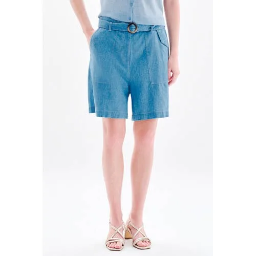 Voor warme dagen is deze blauwe bermuda short van linnenmix voor dames een comfortabele en stijlvolle keuze. De short heeft een recht, iets langer model en valt tot halverwege het bovenbeen. Het denim-effect geeft een ontspannen uitstraling, terwijl de verstelbare riem je taille mooi laat uitkomen en zorgt voor een verzorgd silhouet.Details die het verschil maken Bermuda short met rechte pasvorm en regular waist Verstelbare ceintuur in de taille voor een aangesloten look Zakken vooraan voor een praktische en casual uitstraling Totale lengte 46,5 cm bij maat 38 Gemaakt van 50% katoen, 25% linnen en 25% lyocell voor een lichte, luchtige stof Rits- en knoopsluiting aan de voorkant Effen blauwe kleur met subtiel denim-effect, goed te combinerenGeschikt voor zomerse dagenDeze bermuda short is gemaakt voor zomerse temperaturen. De lichte stof voelt prettig aan op de huid en blijft luchtig tijdens een dag in de stad, op vakantie of op een terras. Draag de short met een soepel vallende top en sandalen voor een relaxte look, of met een fijngebreid vest en nette schoenen voor een verzorgde outfit.Caroll, aandacht voor pasvorm en stijlCaroll staat bekend om tijdloze collecties met aandacht voor pasvorm en nette afwerking. Het merk focust op kleding die je makkelijk combineert en waarin je je de hele dag prettig voelt. Deze bermuda short past daar goed bij en vormt een veelzijdige basis in je zomergarderobe.Een lichte, doordachte short waarmee je de hele zomer comfortabel gekleed gaat.