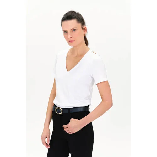 Een fris basisstuk dat je keer op keer uit de kast pakt, dat is dit Caroll T-shirt met V-hals. Het dames T-shirt heeft een rechte pasvorm en een elegante V-hals, waardoor het soepel langs het lichaam valt zonder strak te zitten. Gemaakt van 100% katoen voelt de stof zacht aan op de huid en is het shirt prettig om de hele dag te dragen.Verfijnde details voor elke dag Rechte fit die mooi valt en veel bewegingsvrijheid geeft V-hals die de halslijn subtiel accentueert Schouders versierd met drie kleine, bewerkte knopen voor een stijlvol detail Korte, rechte mouwen die luchtig en comfortabel aanvoelen Effen ontwerp, makkelijk te combineren met al je broeken en rokken Lengte van ongeveer 62 cm in maat S voor een klassieke, heuplange snit Gemaakt van 100% katoen voor een soepele en aangename touchEen basis T-shirt dat overal bij pastDit T-shirt komt tot net over de heup, wat het ideaal maakt om los te dragen op een jeans, in een nette broek te stoppen of half in een rok te stylen. De effen kleur en rustige vormgeving zorgen ervoor dat het shirt zowel casual als meer gekleed ingezet kan worden, van een werkdag tot een ontspannen weekend.Caroll: franse eenvoud met aandacht voor detailCaroll staat bekend om vrouwelijke basics met een verzorgde afwerking. Elk ontwerp krijgt een kleine twist, zoals het knoopdetail op de schouder, zodat je garderobe praktisch blijft en toch verfijnd oogt. Met dit T-shirt haal je een betrouwbaar kledingstuk in huis dat lang mooi blijft en makkelijk te combineren is.Een veelzijdig T-shirt dat je dagelijkse outfits rustig, stijlvol en verzorgd maakt.
