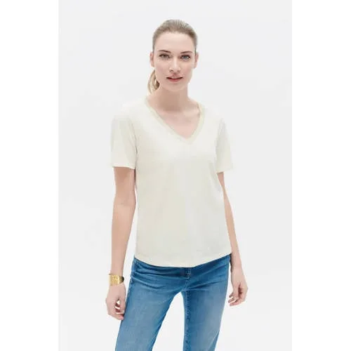 Deze dagelijkse basic krijgt een subtiel bijzonder accent met het Caroll T-shirt met V-hals. Het model heeft een rechte pasvorm en korte mouwen, waardoor het ruim genoeg zit zonder vorm te verliezen. De combinatie van katoen en linnen zorgt voor een luchtig en soepel tricot, geschikt voor warme dagen of als laagje onder een vest of blazer.Verfijnde details in een eenvoudig ontwerp Rechte fit voor een ontspannen, maar verzorgde uitstraling V-hals met goudkleurige ribboord voor een subtiel accent Korte, rechte mouwen die comfortabel om de bovenarm vallen Linnen-katoen tricot: katoen voor zachtheid, linnen voor een luchtig gevoel Lengte ongeveer 62 cm in maat S, prettig op broek of rok te dragen Effen uitvoering, makkelijk te combineren met prints en basicsMakkelijk te combineren in jouw garderobeDit T-shirt past bij veel verschillende momenten op de dag. Draag het op een jeans voor een ontspannen look of combineer het met een rok of nette broek voor een meer geklede combinatie. De goudkleurige boord geeft net genoeg detail, waardoor je met weinig accessoires toch een verzorgde outfit draagt.De stijl van CarollCaroll staat bekend om kleding die modern en vrouwelijk tegelijk is, met aandacht voor draagbaarheid en mooie afwerking. Elk item is doordacht ontworpen, zodat het comfortabel aanvoelt en lang in je kast mee kan. Dit T-shirt sluit daarbij aan en vormt een vaste basis in je garderobe.Een lichte top die je eenvoudig op vele manieren inpast in je dagelijkse outfits.