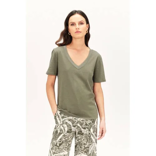 Een basic met een bijzonder detail, dat is dit Caroll T-shirt met V-hals. Het T-shirt heeft korte mouwen en een rechte pasvorm die soepel langs het lichaam valt. De tricot is gemaakt van 70% katoen en 30% linnen, waardoor de stof luchtig aanvoelt en prettig is op warmere dagen. Blikvanger is de V-hals, afgewerkt met een goudkleurige ribboord die een subtiel kleuraccent aan je outfit geeft.Verfijnde basics met een gouden accent Rechte fit met comfortabele, losjes vallende pasvorm V-hals met goudkleurige ribboord als opvallend detail Korte, rechte mouwen voor een eenvoudige, rustige belijning Luchtige tricot van 70% katoen en 30% linnen Lengte circa 62 cm in maat S, passend op een jeans of rok Effen kleur, goed te combineren met diverse kledingstukkenEenvoudig te combineren in je dagelijkse outfitsDit T-shirt leent zich goed voor alledaagse momenten. Combineer het met je favoriete jeans voor een casual dag of draag het onder een blazer voor een afgestemde set. De V-hals biedt ruimte bij de hals en laat sieraden duidelijk uitkomen.Caroll: mode met aandacht voor pasvorm en detailsCaroll ontwerpt kleding met aandacht voor pasvorm en uitgewerkte details. De collecties zijn opgebouwd uit items die onderling goed te combineren zijn, zodat je gemakkelijk verschillende sets maakt. Zo ontstaat stap voor stap een garderobe die past bij jouw dagelijkse leven.Een T-shirt dat je eenvoudig inzet in uiteenlopende combinaties.