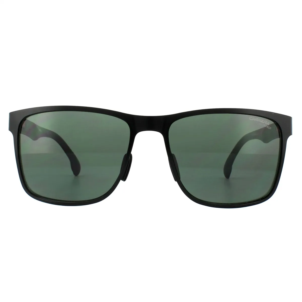 Carrera zonnebrillen 8026/s 003 QT Matt Black Green hebben rubber megol tempeltips en neuskussens gekregen voor extra grip en comfort, verder verbeterd met de geïntegreerde veerscharnieren. Het voorframe is vierkant gevormd en gemaakt van metaal voor een sterke mannelijke look