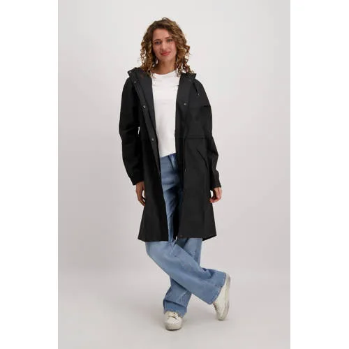 Deze SHARONNE-regenjas van Cars in zwart is perfect voor dames. De jas heeft een capuchon en lange mouwen. Hij sluit met drukknopen, is waterafstotend en voorzien van zakken aan de voorkant.