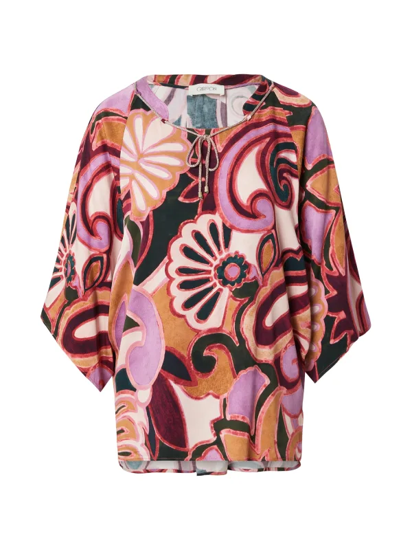 Blouse type: Wijde blouse; Design: Vleermuismouwen, Met band/snoer; Materiaal: Viscose; Motief: Paisley; Kraag: Zonder kraag; Extra's: All-over patroon, Lichte stof; Pasvorm: Losse pasvorm; Armlengte: Driekwart mouw; Lengte: Normale lengte