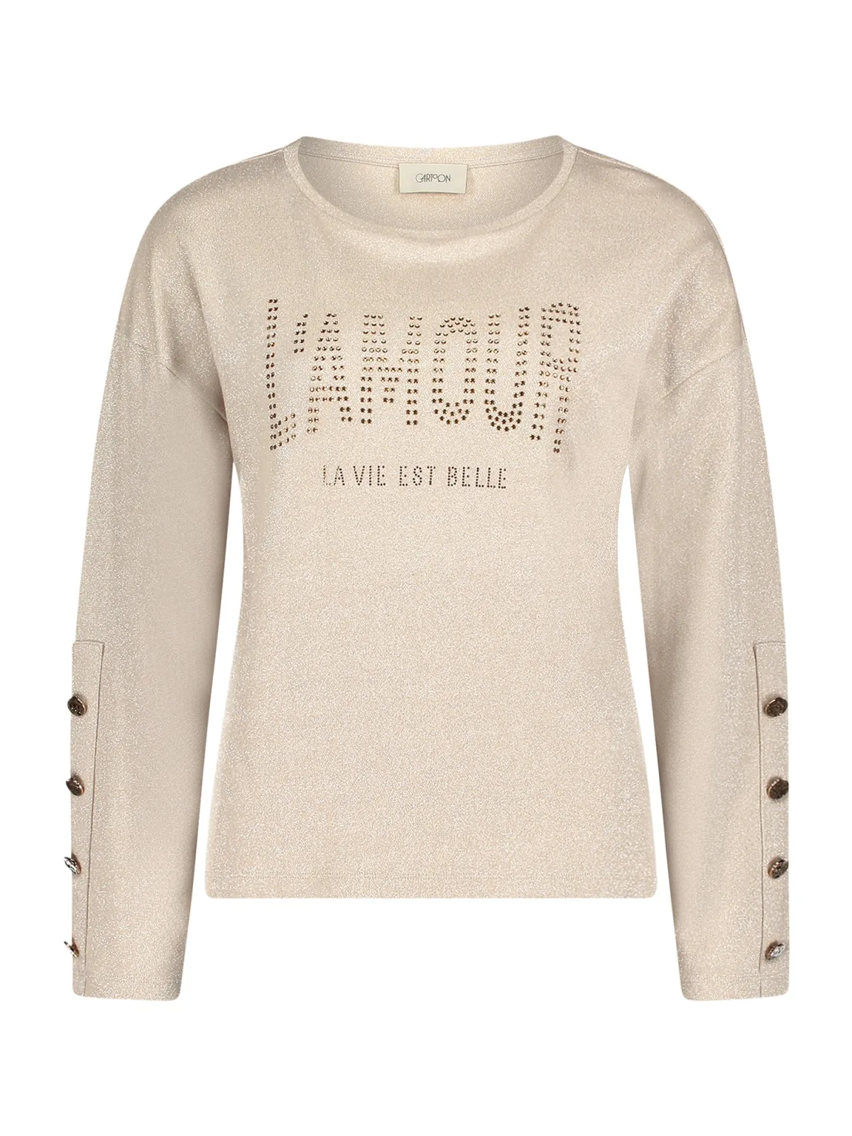 Design: Gevoerde zoom/rand, Rechte zoom, Overcut schouder; Materiaal: Sweatstof; Halstype: Ronde hals; Motief: Tekst print; Details: Sierstenen; Extra's: Glitterend, Applicaties, Buigzame grip; Pasvorm: Losse pasvorm; Armlengte: Lange mouw; Lengte: Normale lengte