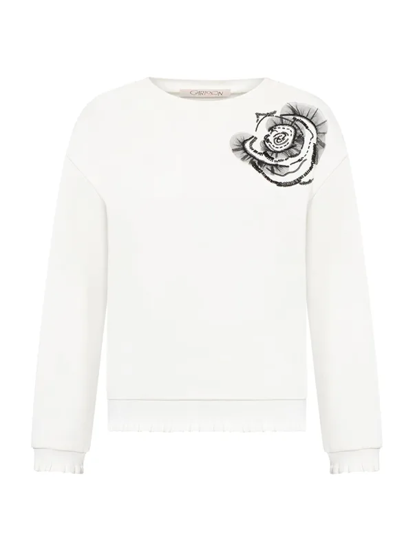 Design: Geribbelde kraag, Geribd ceintuurtje, Overcut schouder, Geschulpte zoom; Materiaal: Sweatstof; Halstype: Ronde hals; Motief: Bloemenprint; Details: Pailletten, Sierstenen; Extra's: Mesh, Applicaties, Op staal naden, Voelt zacht aan; Pasvorm: Normale pasvorm; Armlengte: Lange mouw; Lengte: Normale lengte