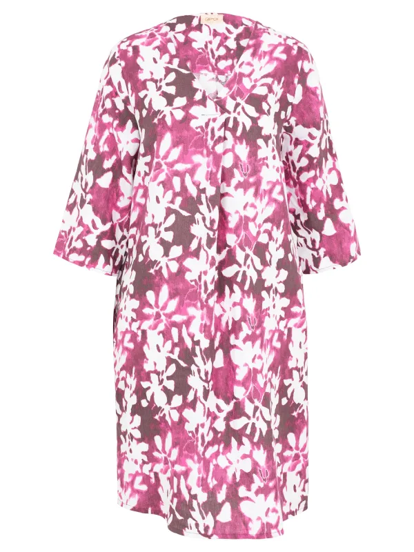 Design: Gevoerde zoom/rand, Rugplooi; Materiaal: Linnen; Halstype: V-hals; Motief: Bloemenprint; Details: Plooien; Extra's: All-over patroon; Lengte: Knielengte; Pasvorm: Losse pasvorm; Armlengte: Driekwart mouw