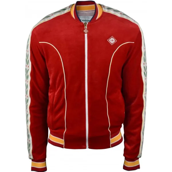 Laurel trainingsjack van Casablanca rood katoenfluweel.Iconische laurier gebreide satijnen streep langs de mouwen.Geborduurd logopatch op de borst.Elastische uiteinden.Geel en wit gestreepte uiteinden.Zijzakken met ritssluiting.Hoofdritssluiting.