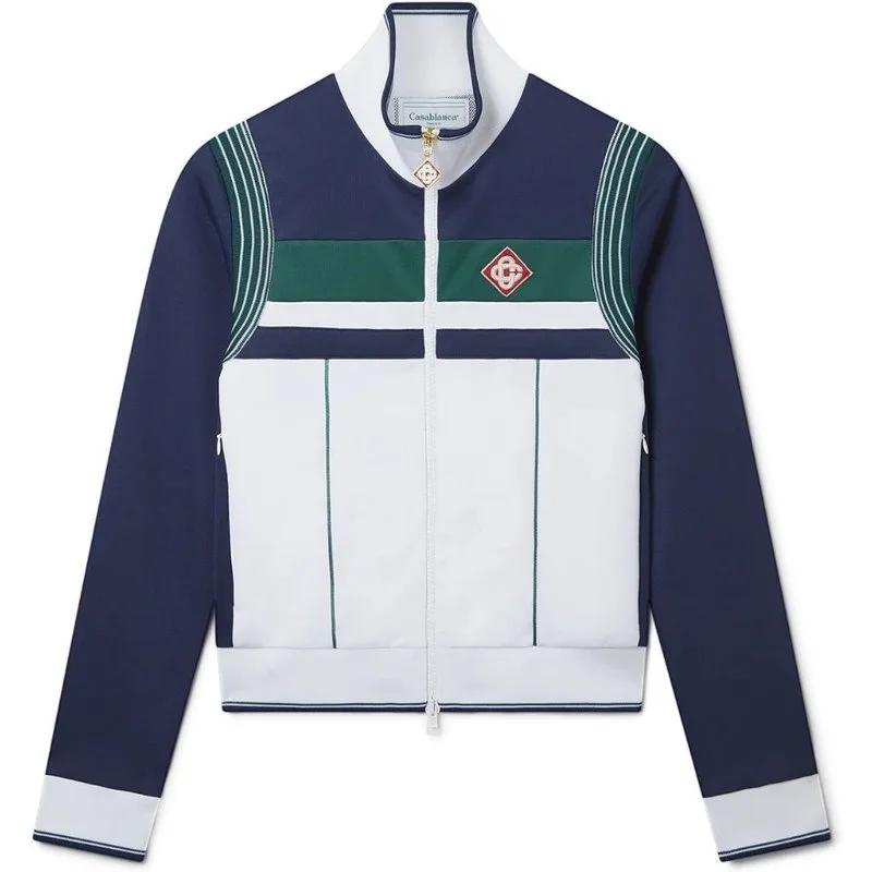 Het Casablanca trainingsjack met geribbelde armsgaten combineert een eigentijds design met praktisch comfort. Dit donkerblauwe jack is vervaardigd in Portugal van een ademende mix van 53% polyester en 47% katoen en heeft opvallende geribbelde armsgaten voor een verfijnde look. De uitgebalanceerde stofsamenstelling zorgt voor duurzaamheid en is gemakkelijk te onderhouden, waardoor het een ideaal kledingstuk is om in laagjes te dragen, zowel voor dagelijks gebruik als voor een sportieve stijl. Perfect voor wie op zoek is naar een hoogwaardige constructie met ingetogen elegantie