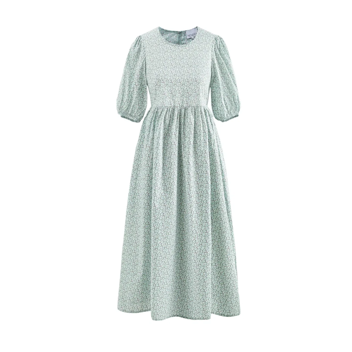 Een lichte en vrouwelijke midi-jurk met een delicate all-over bloemenprint. Hij heeft korte pofmouwen, een ronde hals en een zacht geplooide taille die een flatterend silhouet creëert. De luchtige stof en het eenvoudige ontwerp maken hem perfect voor dagelijks gebruik of casual zomerse gelegenheden.